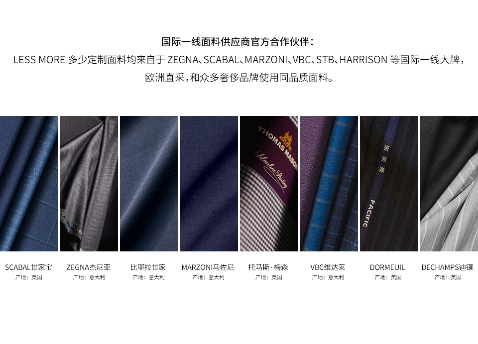 LESS MORE多少定制 2015年5月創立于北京,以互聯網思維和工業4.0切入服裝定制領域,獨創“互聯網預約+旗艦店體驗+免費上門量體+工業4.0 C2M生產”的模式,現已成為國內服裝定制行業的標桿品牌。